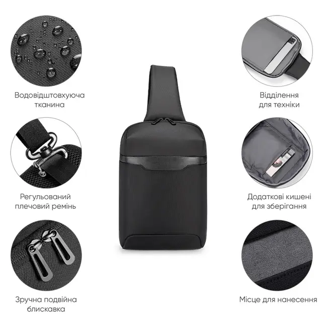 | Коротко | Рюкзак на одно плечо. Высококачественный водонепроницаемый 100% полиэстер. Основной отдел. Отдел для планшета. Карман органайзер. Мягкая спинка и лямка. |