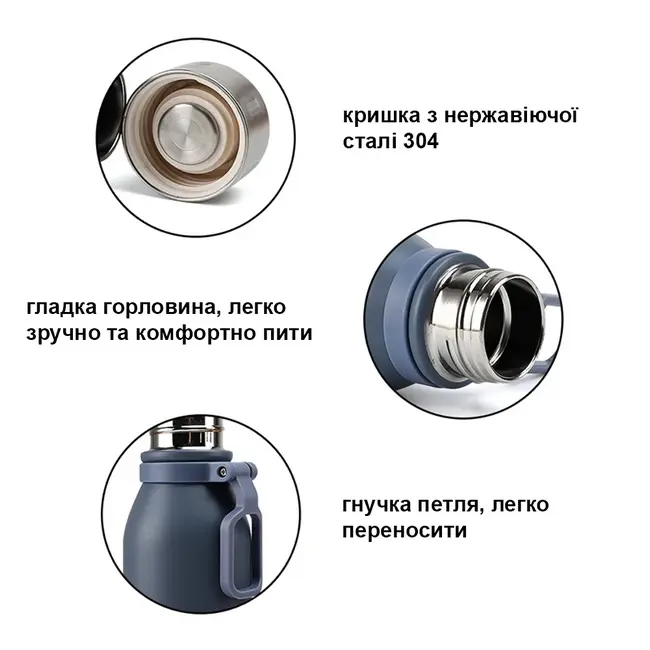| Коротко | Подвійні стінки. Харчова нержавіюча сталь AISI 304. Герметична кришка на різьбі. Горловина з товстими полірованими стінками комфортна та безпечна для пиття навіть дитині. Утримує тепло 8-12 годин. |